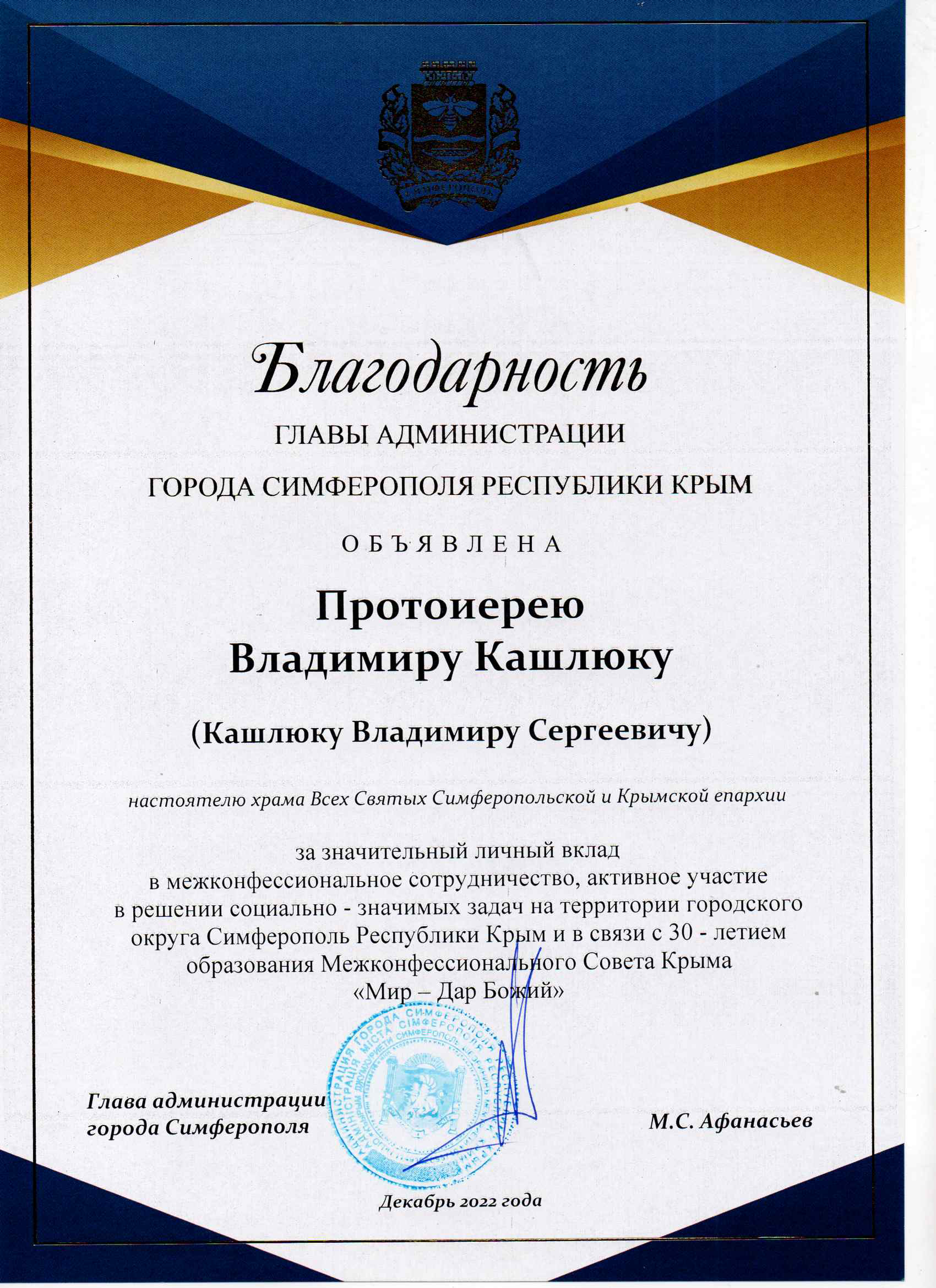 Так, Почетной грамотой Администрации города Симферополя Республики Крым награждён благочинный I Симферопольского округа протоиерей Богдан Северин, Благодарность Главы Симферополя объявлена благочинному II Симферопольского округа протоиерею Иоанну Шимону и руководителю отдела пресс-службы Крымской митрополии, настоятелю храма Всех Святых г. Симферополя, кандидату богословия, протоиерею Владимиру Кашлюку. Благодарственным Письмом Администрации города Симферополя наградили Православный молодёжный просветительский центр «Зёрна».
